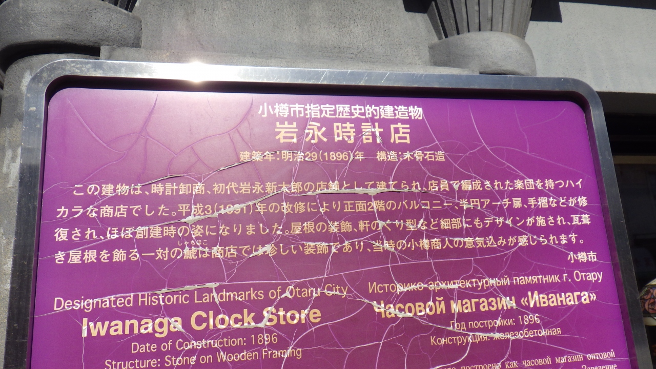 小樽市が設置した案内板によると、市指定歴史的建造物に指定されている明治29年建築の木骨石造で、平成3年バルコニー、半円アーチ扉、手摺などが修復されて創建当時の姿に戻ったそうで、商店では珍しい鯱があったりと当時の小樽商人の意気込みが感じられる、小樽歴史探訪には外す事の出来ない見る価値ありの建築物です。