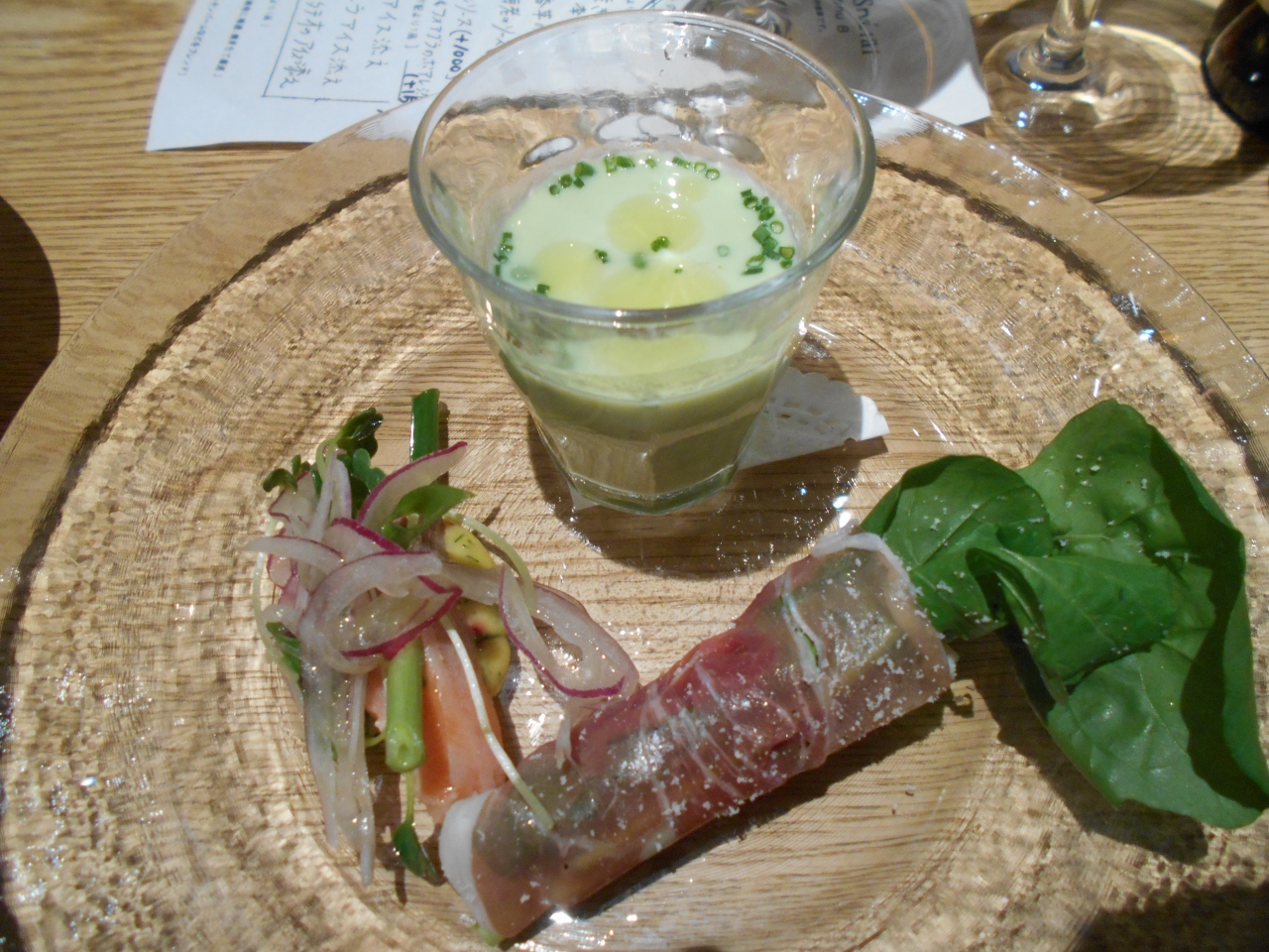 1.本日のオードブル盛り合わせ;グリーンピース冷製スープ、桜マスコンフィ香草マユネーズ添え、パルマ産生ハムとルッコラと苺のサラダ