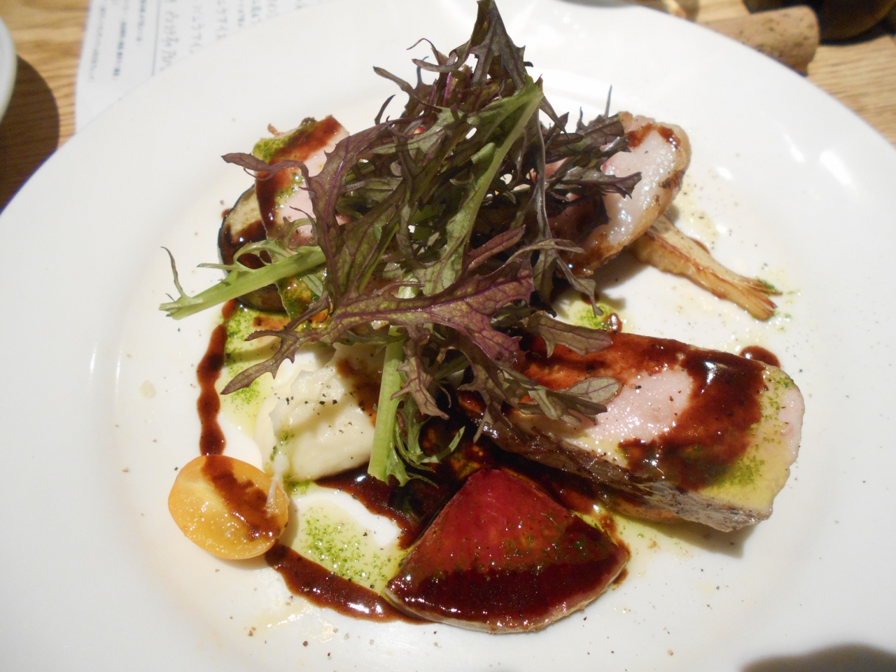2.主菜(肉/魚選択);ハーブ豚ロース網焼き赤水菜添え/真鯛のポアレ・・・