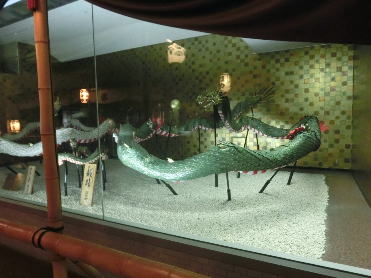 ここでは、長崎の秋祭り「長崎くんち」で使われる龍踊りの白龍、青龍や各町の奉納踊りを先導する傘鉾などが飾られている。