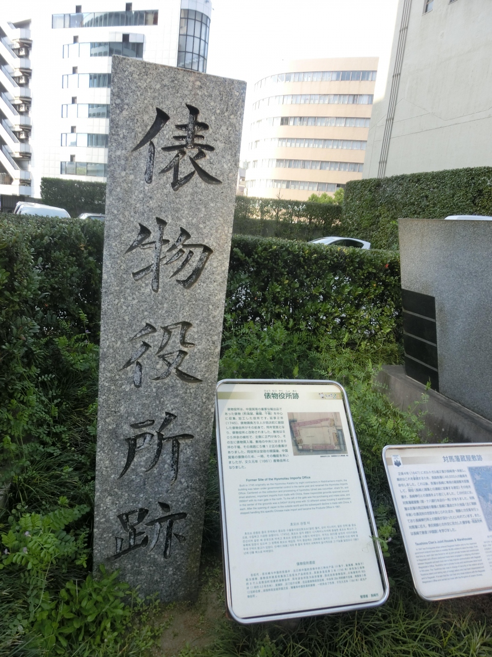 十八銀行本店前の植え込みにいくつかの記念碑や屋敷跡を示す案内板が建っていました。