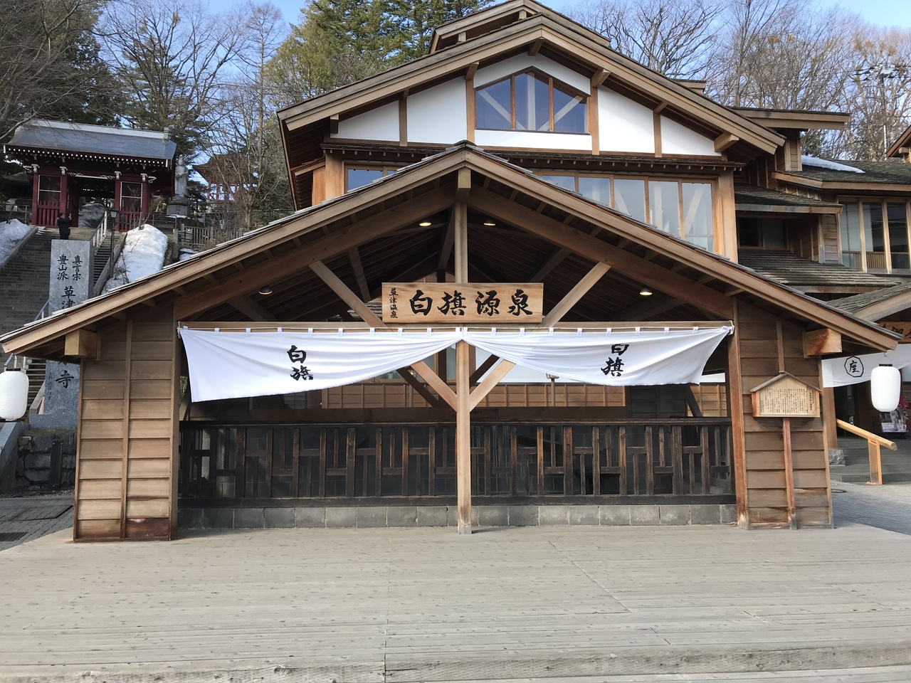 白旗の湯は、草津温泉の中心部の湯畑の前にあり、御座之湯と熱乃湯の施設に挟まれた形で建っている共同浴場。入湯料は無料。