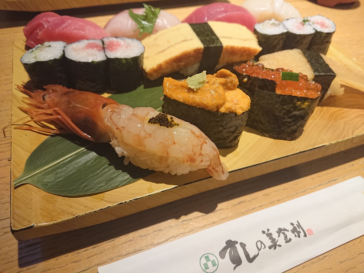 特上にぎり1600円(有頭海老・うに軍艦・いくら軍艦・数の子・ネギトロ巻き・玉子・ほたて・まぐろの赤身・中トロ・ぶり)