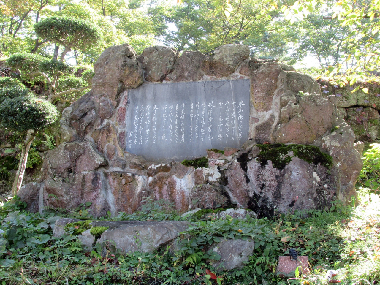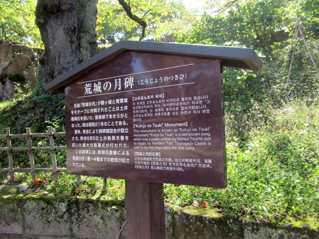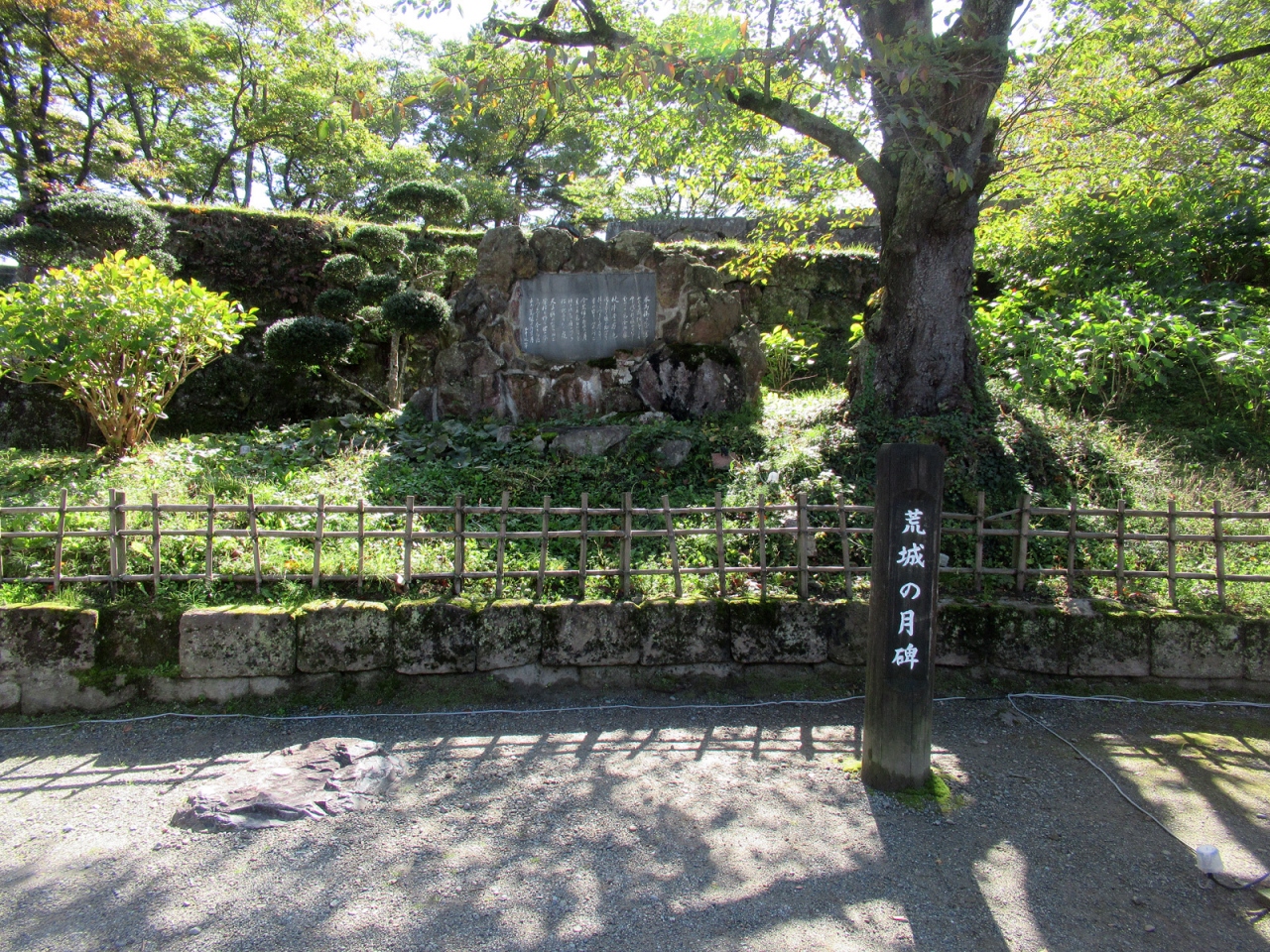 『荒城の月』って、知ってはいても、その歌詞が現実離れしていてピンとこなかったのですが、仙台青葉城と共に、土井晩翠が詩の構想を得たのが鶴ヶ城と知り、ここならば詩のイメージにぴったりだと思いました。まさしく会津は西軍の蛮行によって悲惨な末路を迎えたのですから。碑は「鶴ヶ城公園」の一角にひっそりとありましたが、その荒々しい岩のような碑も、また詞のイメージに合っていると思いました。