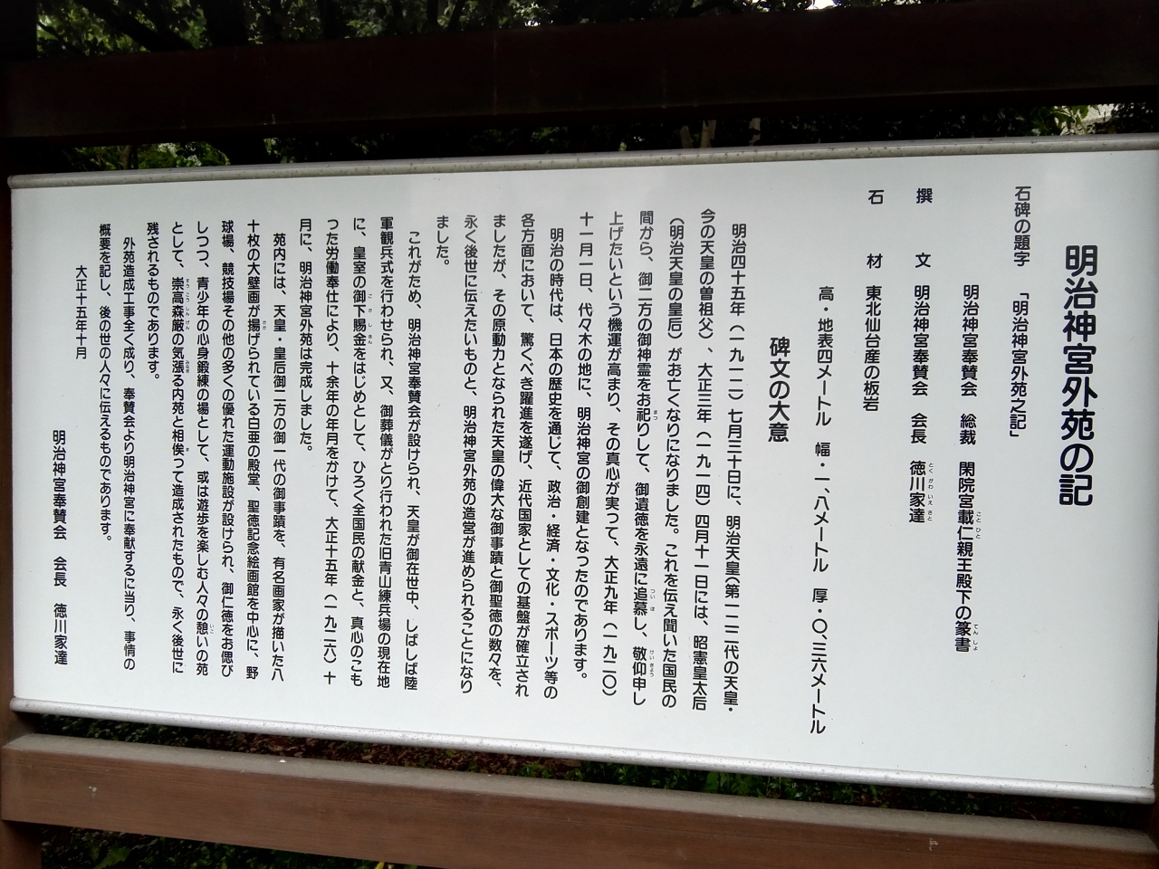 明治天皇とその皇后がお亡くなりなられた後、国民の追慕の機運が高まり大正九年に明治神宮が創建されたと説明があります。そして、旧青山練兵場の跡地に明治新宮外苑が出来たとのこと。興味深い内容が記された碑文です。