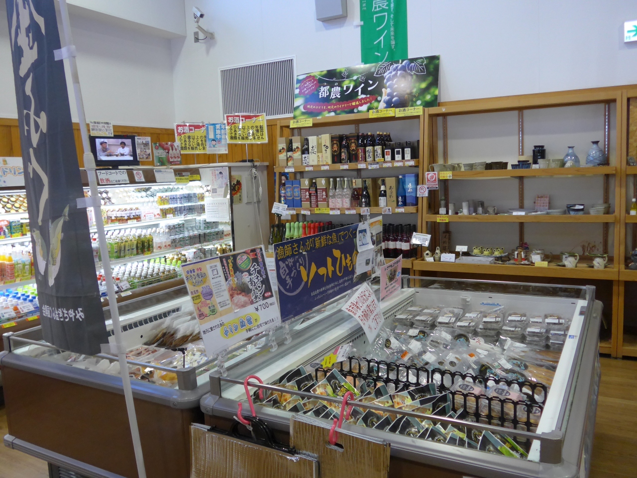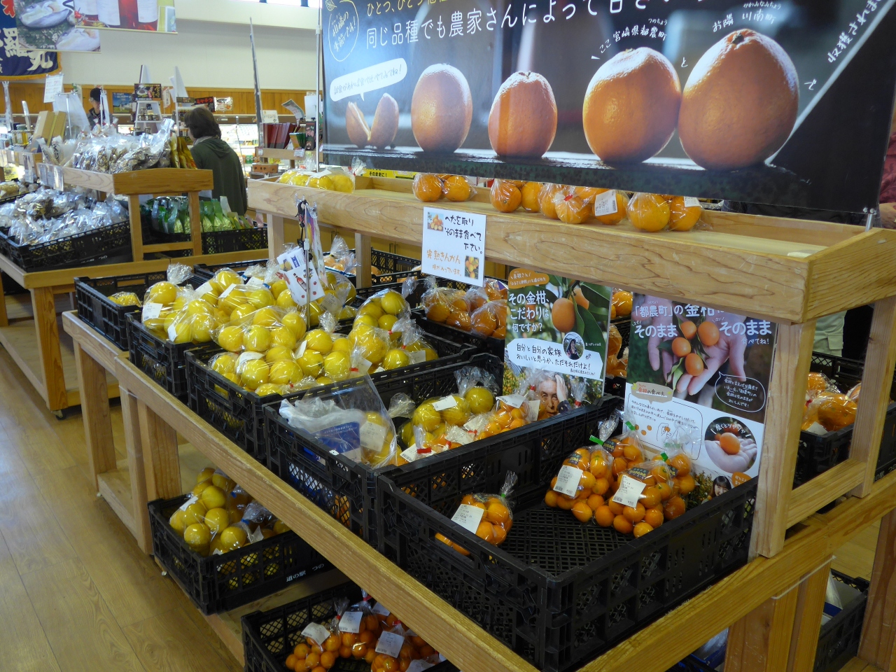 お土産品に試食した特産品の金柑「たまたま」と都農で有名な「都農ワイン」を購入しました。お焼酎も海産物もお野菜も沢山扱っていました。