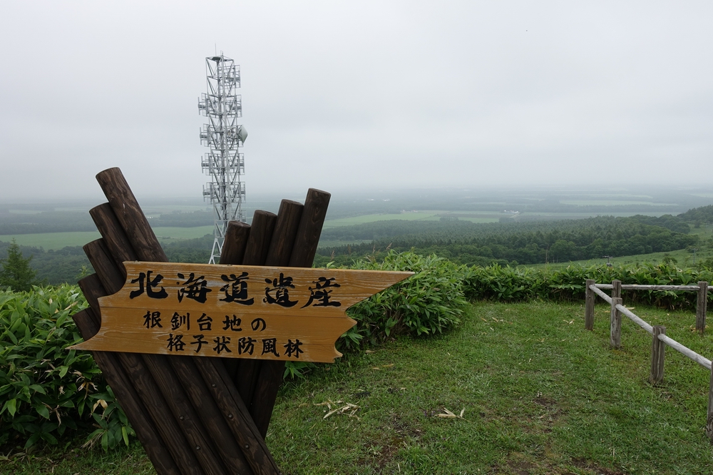 開陽台に行った際、乳牛の像の隣に「根釧台地の格子状防風林」の案内板が出ていました。案内板の遠く向こうを見ると、たしかに四角く囲まれているように見えなくはないです。