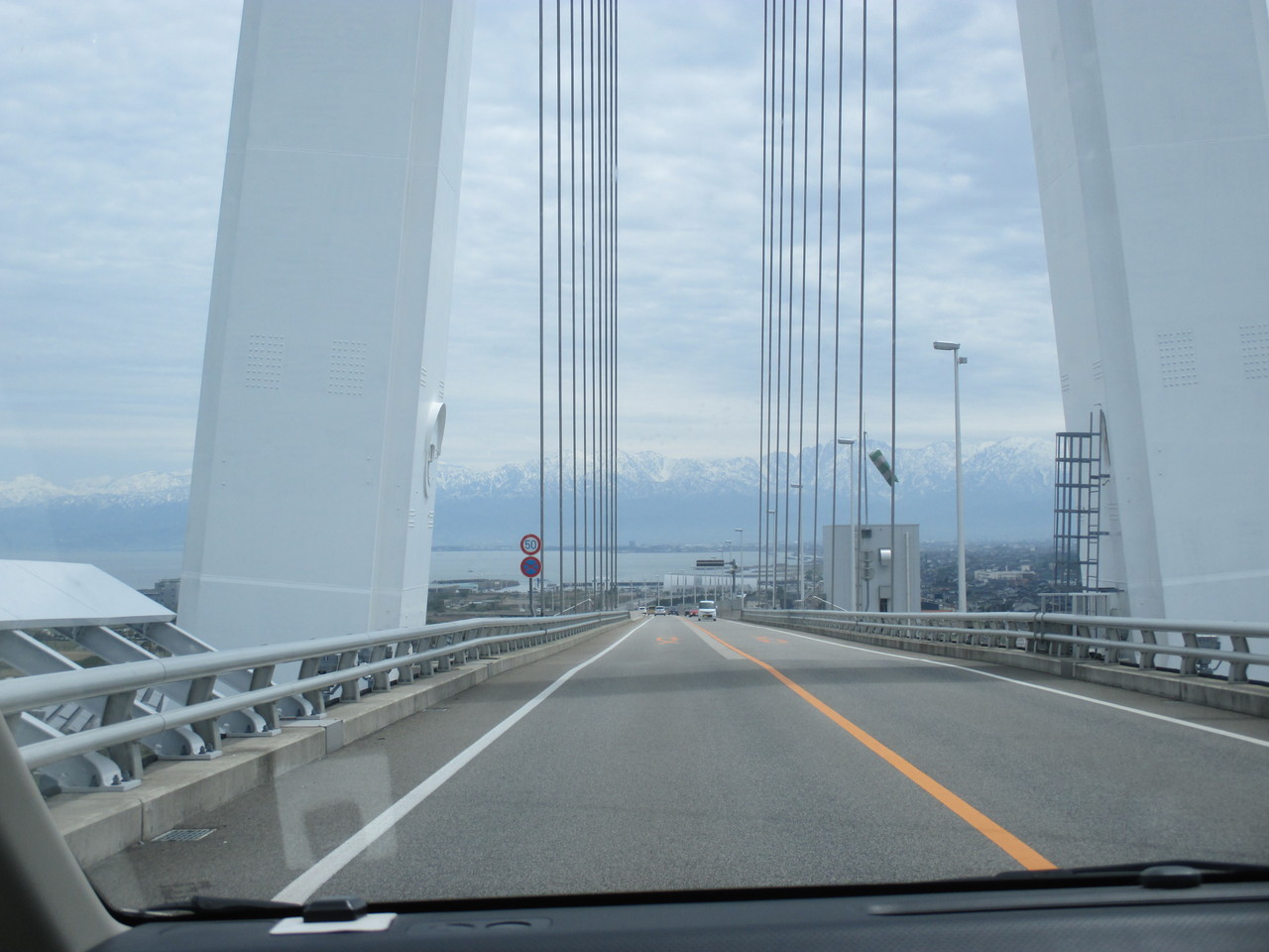 車で海王丸パークに立ち寄った後で、ヒスイ海岸に向かう為に、口コミ評価の良い新湊大橋を西から東に渡りました。初めて渡ったのですが、東に向かう、ちょうど車のフロントガラスからは見事な雪をかぶった山並みが見えました。北には海、東に山並みと白く真新しい新湊大橋のアーチの絶景が楽しめて良い思い出になりました!