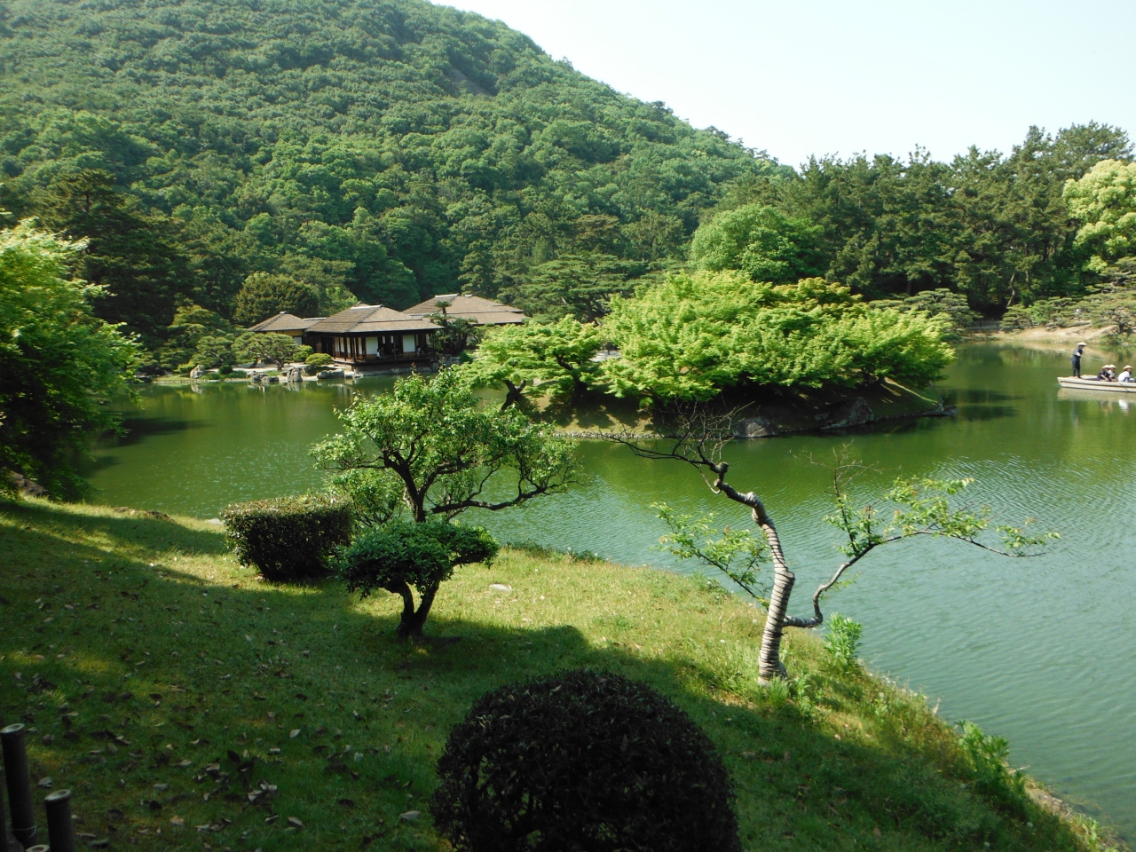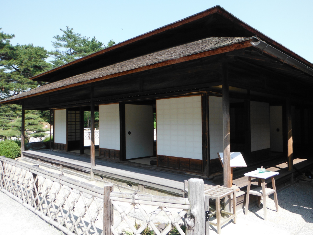 外から湖越しに建物を見ると、南湖に張り出したお部屋で飲むお茶で優雅な気分を味わいたかったなと思います。
