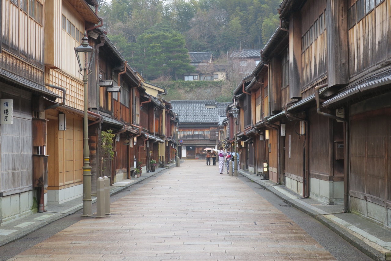 金沢のお茶屋街のなかで一番おおきなお茶屋街です。通りに面した建物もきれいだし、道も石畳でメインストリートが一番風情があり素敵ですが、観光客で混雑しています。早朝と夕方以降になると観光客が減るので、静かに見学したい人はこの時間帯がおすすめです。