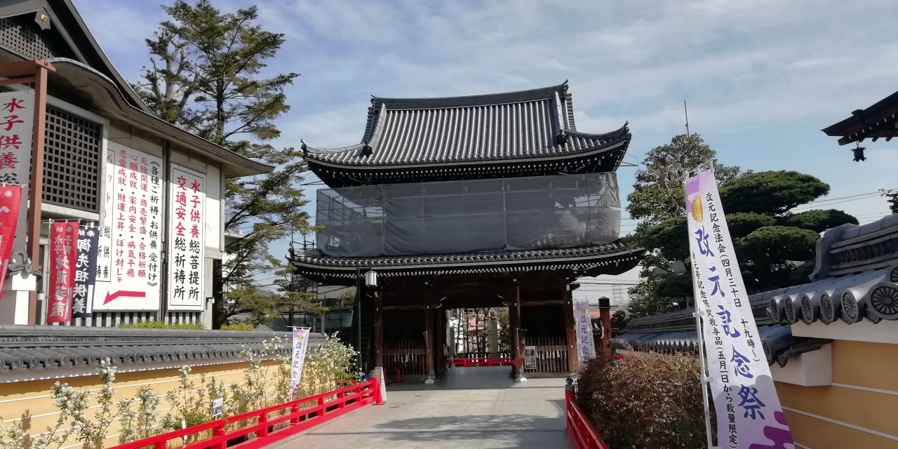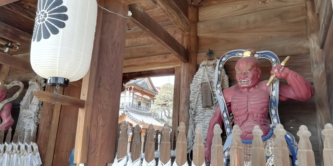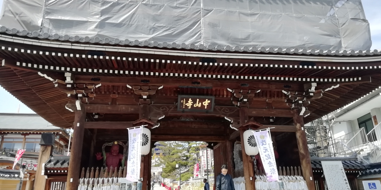 西国24番札所の中山寺は聖徳太子建立の日本最古の観音霊場で多くの堂宇が建ち並びます。JR宝塚駅から徒歩10分程で中山寺の入り口である山門に到着しました。二層の豪壮な門ですが二層部分は修復の覆いが被されていました。門の左右には二体の仁王像が睨みをきかせています。像は修復されたのか朱や青の彩色が鮮やかです。門をくぐり仁王像の裏を見ると狛犬獅子像が鎮座していました。大変珍しい組み合わせです。入山時には前の道路から仰ぎ見た山門ですが下山時に両側に塔頭寺院が並ぶ参道奥から眺めると趣が異なります。二層部の屋根も含め門の全景が見え豪壮さに美しさが加わった感じがしました。