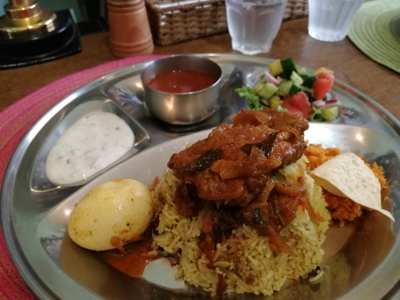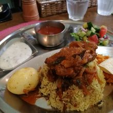 ランチメニューは4種類くらいありました。チキンビリヤニを頂きましたが、香辛料が効いていて美味、ライスに干しぶどうも美味、サラダにパパイヤも美味でアジアのテイストを堪能できます。オススメです。