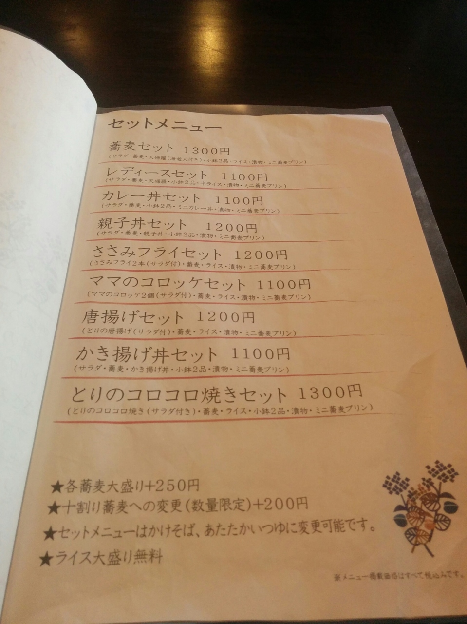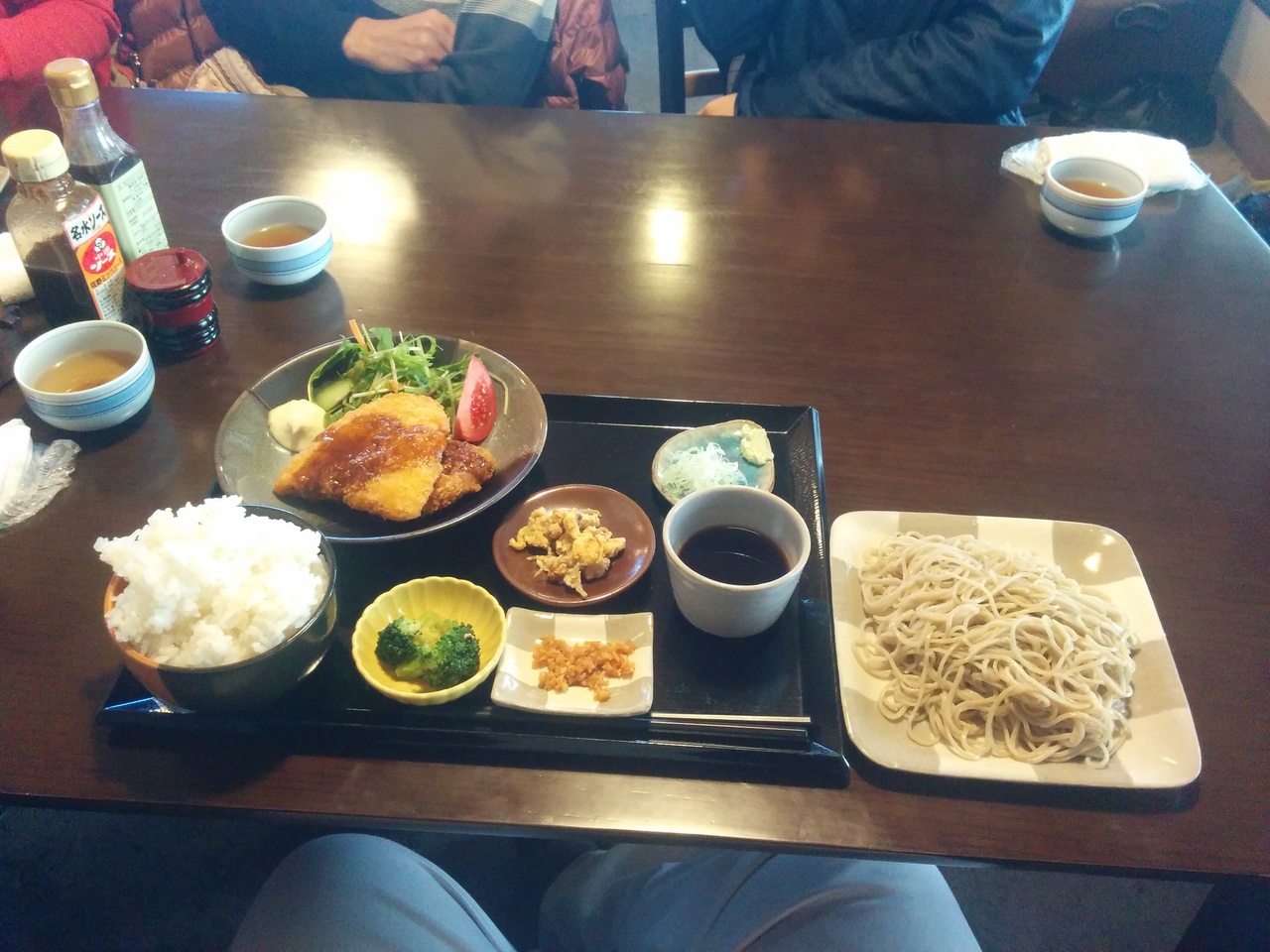 みなさんこんにちは、ふとももぷるぷるです。平成30年12月27日に栃木県足利市にある最近、行列になっているそば処やまもとに行って来ました。先客達がみなさん頼んでいたのがこちらの日替わりランチ980円です。揚げ物2品(今日は、アジフライとコロッケ)小鉢3品、ご飯大盛り、ざる蕎麦、デザート(蕎麦プリン)というすごいボリュームです。お腹いっぱいになるランチでした。お蕎麦も手打ちで美味しかったです。