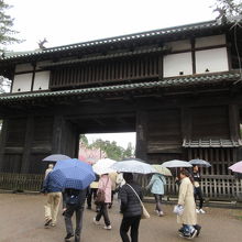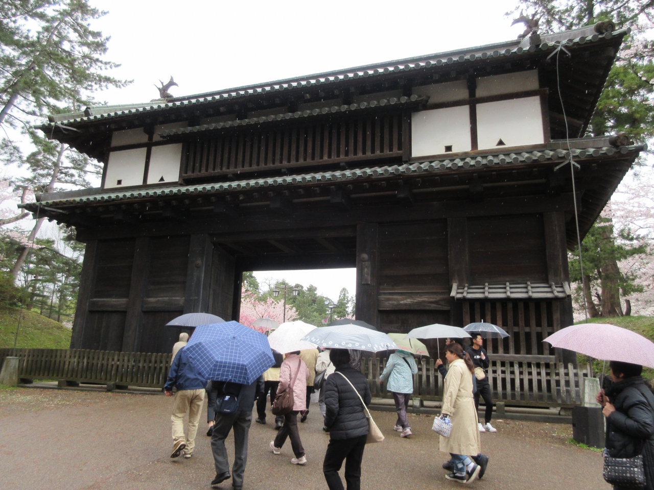 弘前城に残る5つの門の1つで、多くの観光客が出入りする東門口に建っています。屋根に鯱が載っている以外飾り気はなく華やかさはありませんが、木製でどっしりした風格が感じられました。他の門同様、重要文化財に指定されていて、多くの観光客を迎えるのにふさわしい門だと思いました。門の先に咲く桜の美しさが、歴史ある重厚な門を引き立たせていました。