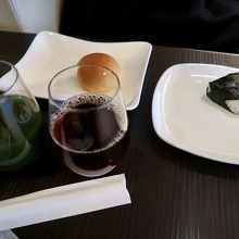 入って右がパンとスープ、左がおにぎりとみそ汁です。
