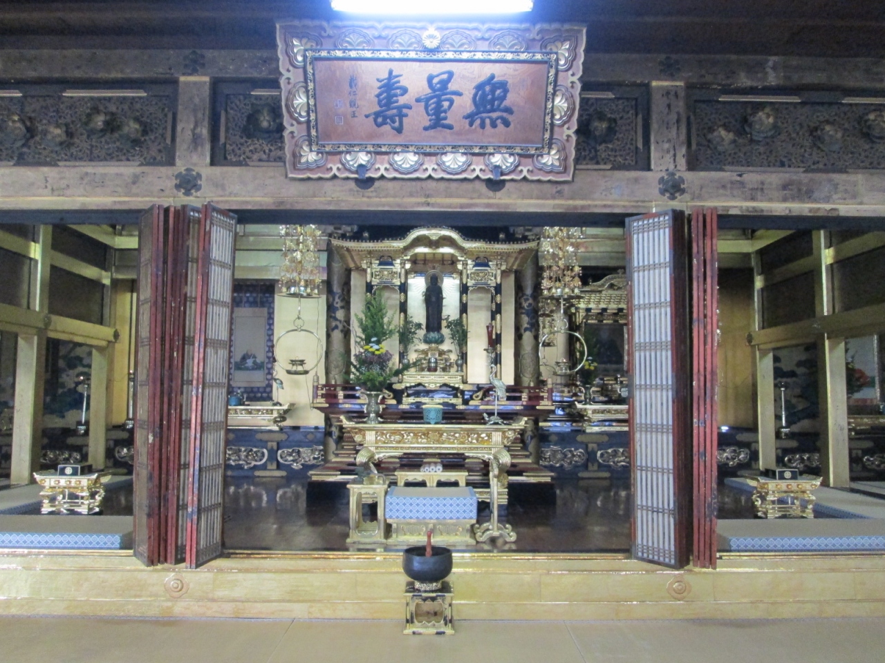 18世紀中頃に落成したといわれる山門をくぐって東本願寺の御堂を移築した本堂に至りますと、大きくきらびやかな仏壇内に本尊の阿弥陀如来が安置されていました。