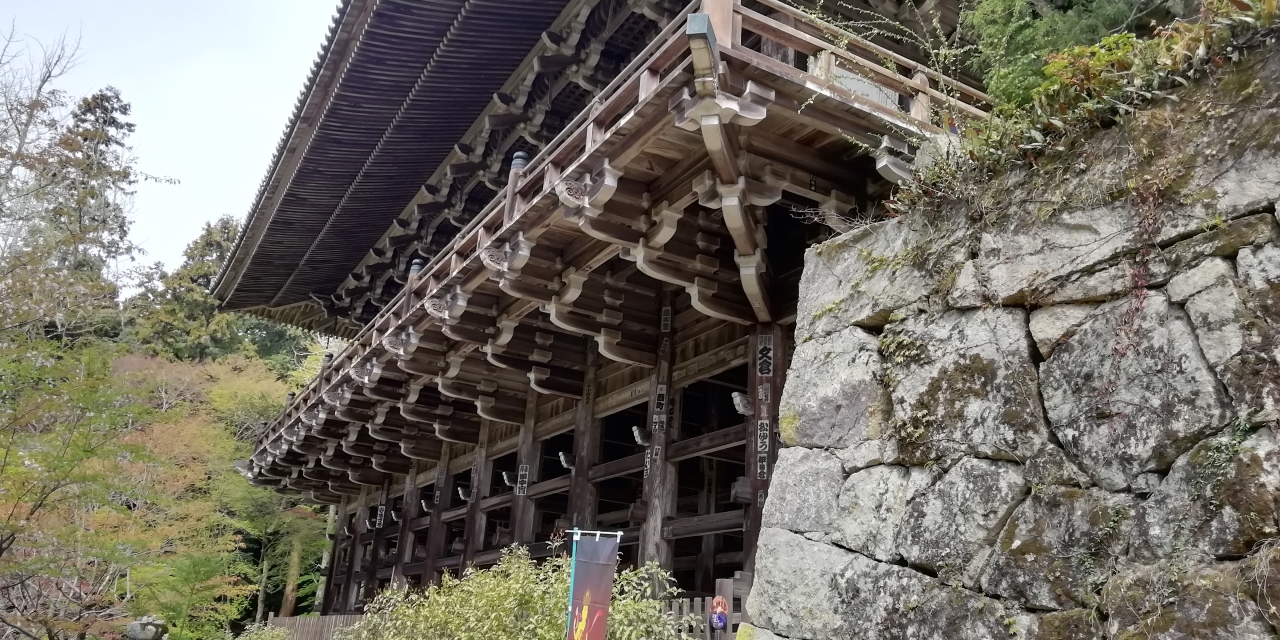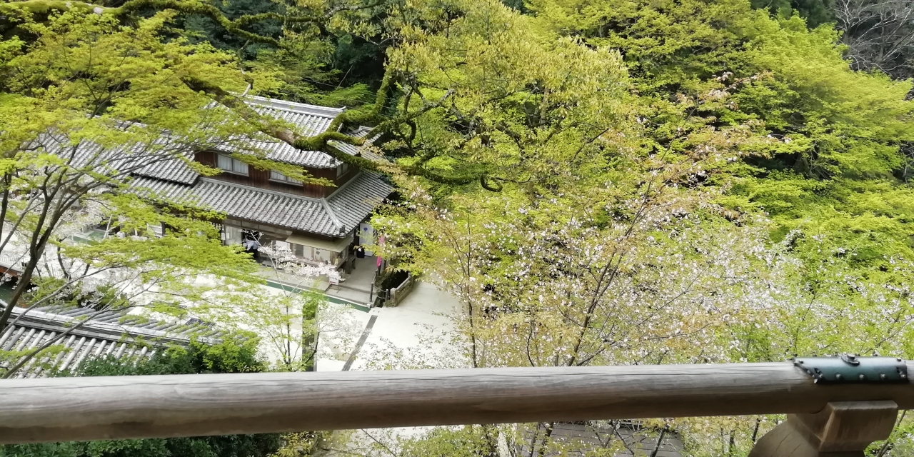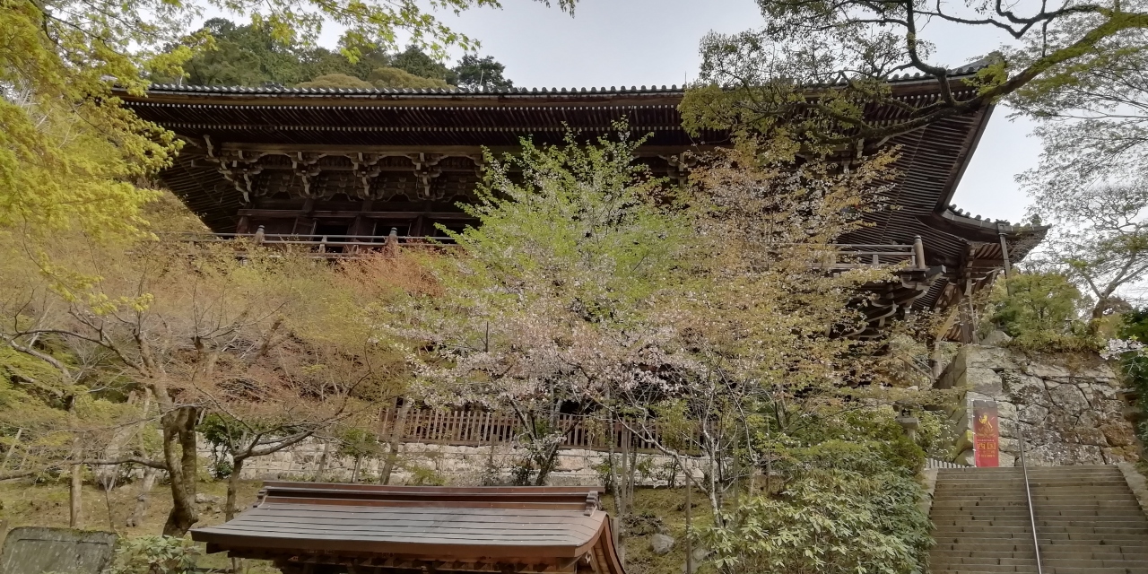 西国27番札所のご本尊である如意輪観音を安置する圓教寺の摩尼殿は書写山ロープウェイの山上駅から参道を徒歩で15分程ですが当日は時間が限られていたため入山料500円に加えて特別志納金500円を支払いマイクロバスで摩尼殿の下まで直行しました。摩尼殿のマニとは梵語の如意のことです。開基の性空上人が崖に生えた桜の霊木に如意輪観音を刻み生木のままご本尊として崇め天禄元年(970年)に建立したと伝わるお堂が摩尼殿です。岩山の中腹に建つお堂でその懸造りは大変迫力があり息を吞みます。舞台や回廊から見下ろす新緑の境内の眺めも見事です。ご本尊の六臂如意輪観世音菩薩は秘仏で毎年1月18日の鬼追いの日に開扉されます。4月19日の参拝でしたので直接拝むことはできませんでしたが厨子に向かい有難く家内安全と健康長寿を祈願しました。