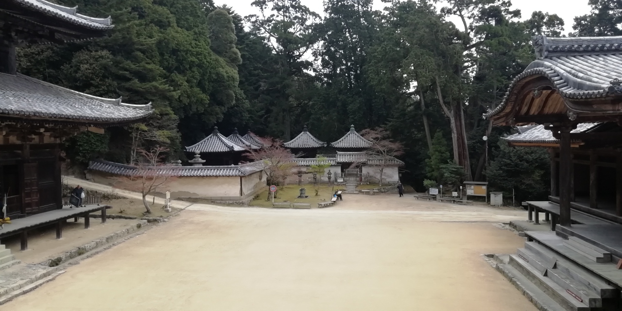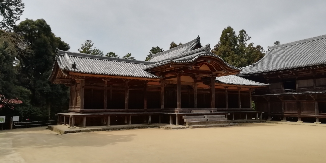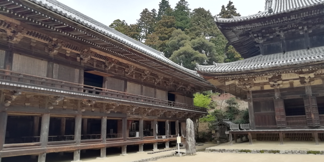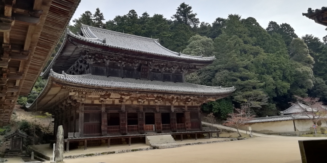 3月に続き4月も西国三十三札所巡り3泊4日旅に出かけました。初日に25番播州清水寺と24番中山寺、二日目に28番成相寺、三日目に4番施福寺と5番葛井寺を参拝、4月19日の最終日の午前中に27番圓教寺を参拝しました。山内は広大です。まず札所ご本尊如意輪観音(秘仏)のある摩尼殿に参拝します。迫力ある懸造りの大きなお堂です。樹齢数百年の杉木立を抜けた先にコの字型の伽藍配置の三之堂(大講堂、食堂、常行堂)があります。静かで凛とした雰囲気が強く印象に残ります。食堂の2階は宝物館になっており見応えがあります。更に奥に進むとひっそりとした佇まいの奥之院開山堂と護法堂と呼ばれる二つの小さな神社があり神仏習合を見ることができます。山内には他に鐘楼、金剛堂、法華堂など多くの堂宇があります。これだけで1時間半近くかかりました。午後に26番札所の一乗寺を参拝予定で時間の制約がありお寺と書写山ロープウェイ駅の往復にお寺のマイクロバス(500円)を利用したため仁王門や摩尼殿までの参道(徒歩15分程)は残念ながらスキップしました。もっとたっぷりと時間をとり摩尼殿の下のお茶屋で昼食休憩をとるという手もあると思います。