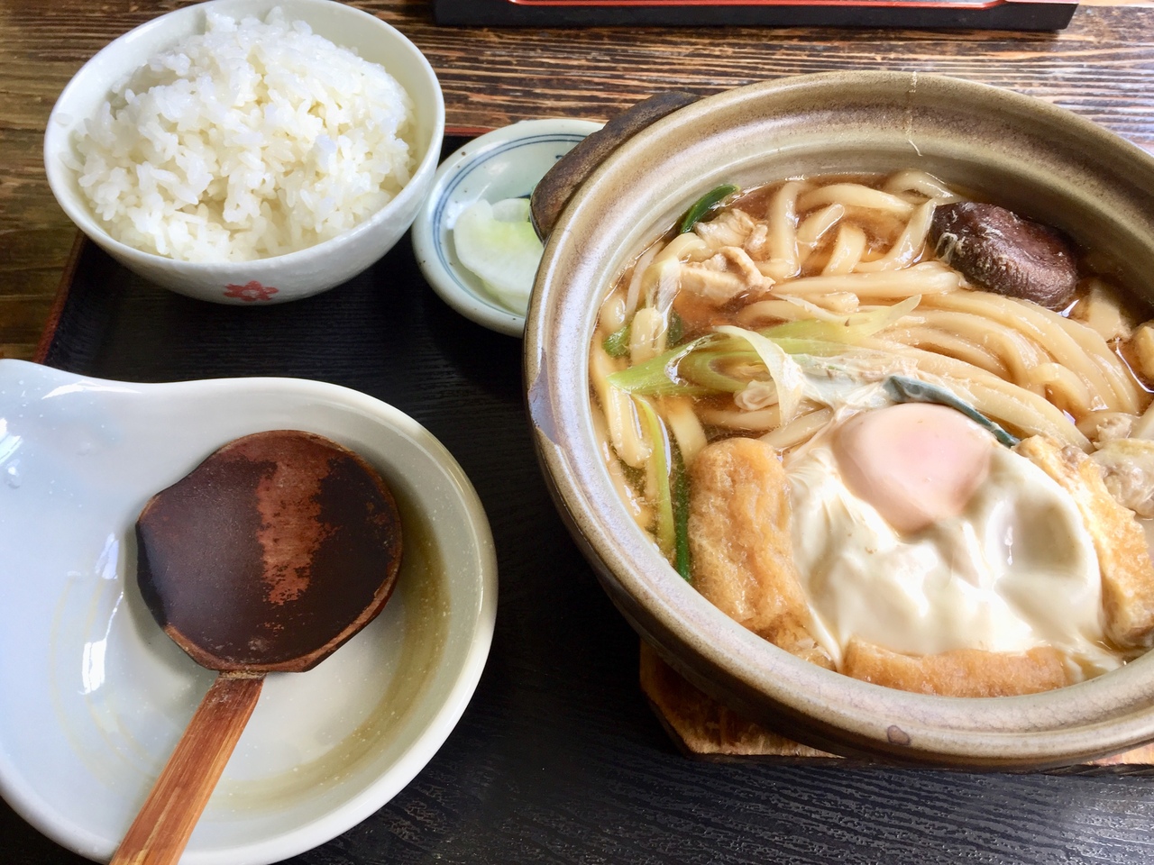 紅葉で有名な香嵐渓近くの足助大橋のたもとにあるうどんやさんで、お昼ごはんに鍋焼きうどん定食をいただきました。