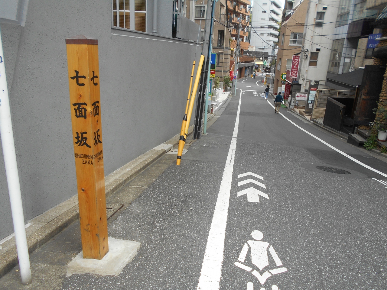 江戸時代は、頂上部は主に武家屋敷、中腹に寺院、谷が田んぼや町家などに分かれていたようです。主な坂道に名前が生まれ、一本松から東に一の橋方面に下る大黒坂の中腹から、北の麻布十番通り方向に下っているのが「七面坂」です。