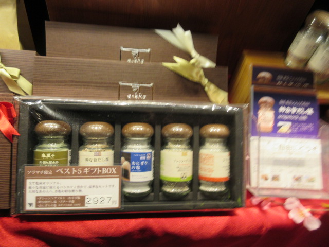 スカイツリーの下にある「ソラマチ」にある、沖縄で有名なお塩屋さんです。沖縄に行ったときにお店を利用して、こちらでもお店を発見したのでたちよりました。たくさんの種類のお塩が並んでいて、試食などもできました。ソムリエもいて、おすすめを紹介してくれます。沖縄のお店にはあった「お塩のソフトクリーム」はなかったので、ちょっとざんねんでした。