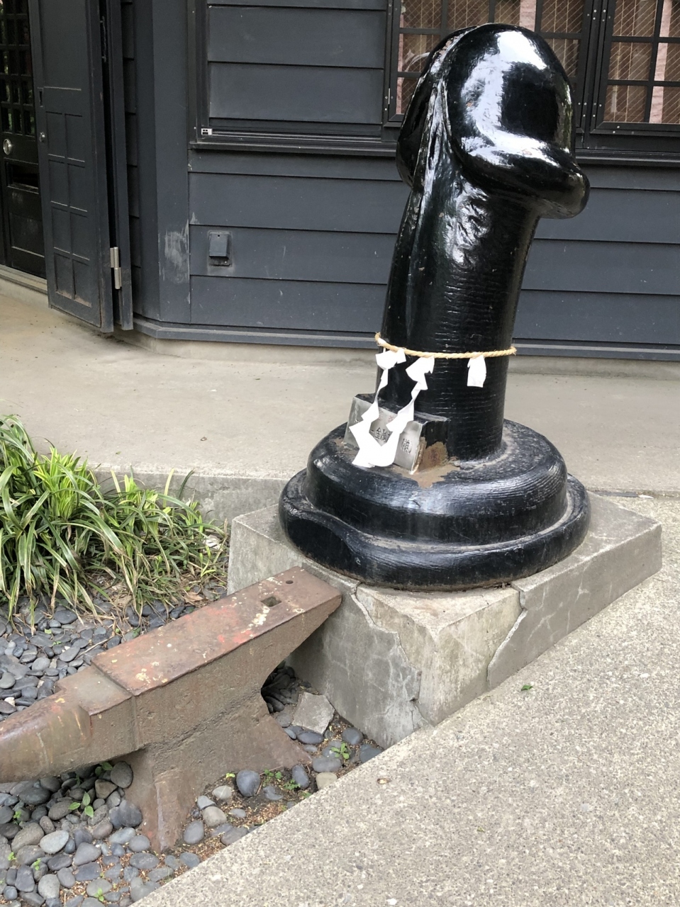 社殿前には金床と恥じらいなく男根が置かれ、実におおらか…ここまで開けっぴろげだと、逆に隠さなくても良いんだなと妙に納得してしまう