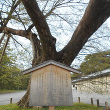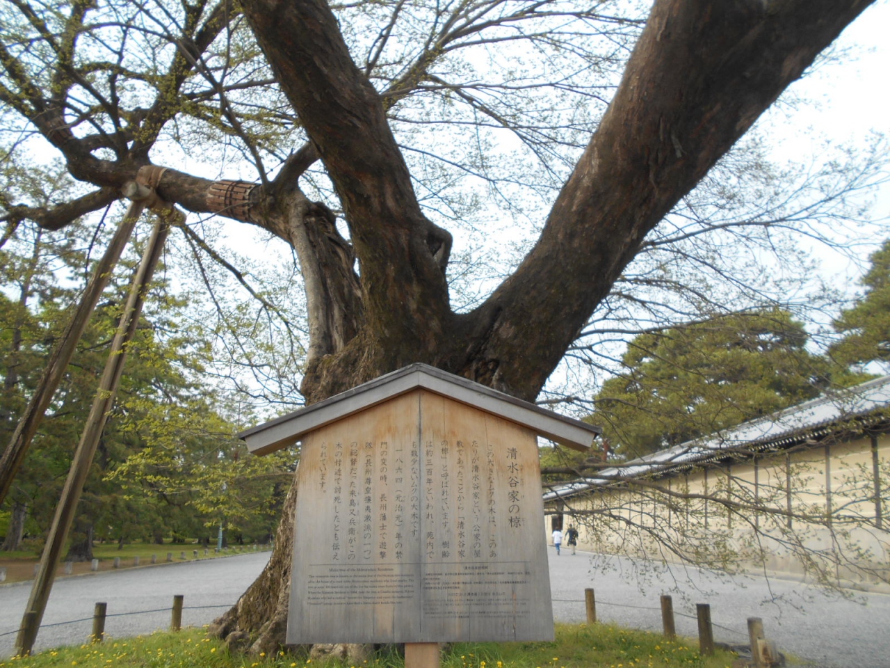 蛤御門を入ってまっすぐ行くと左側に大きな椋の木があります。この椋の木は、清水谷家の公卿邸にあったものです。樹齢300年の古木です。「禁門の変」の時、長州軍の総督であった来島又兵衛が、薩摩軍の攻撃により討死、長州軍は総崩れとなりました。歴史をずっと見守っている木ですね。