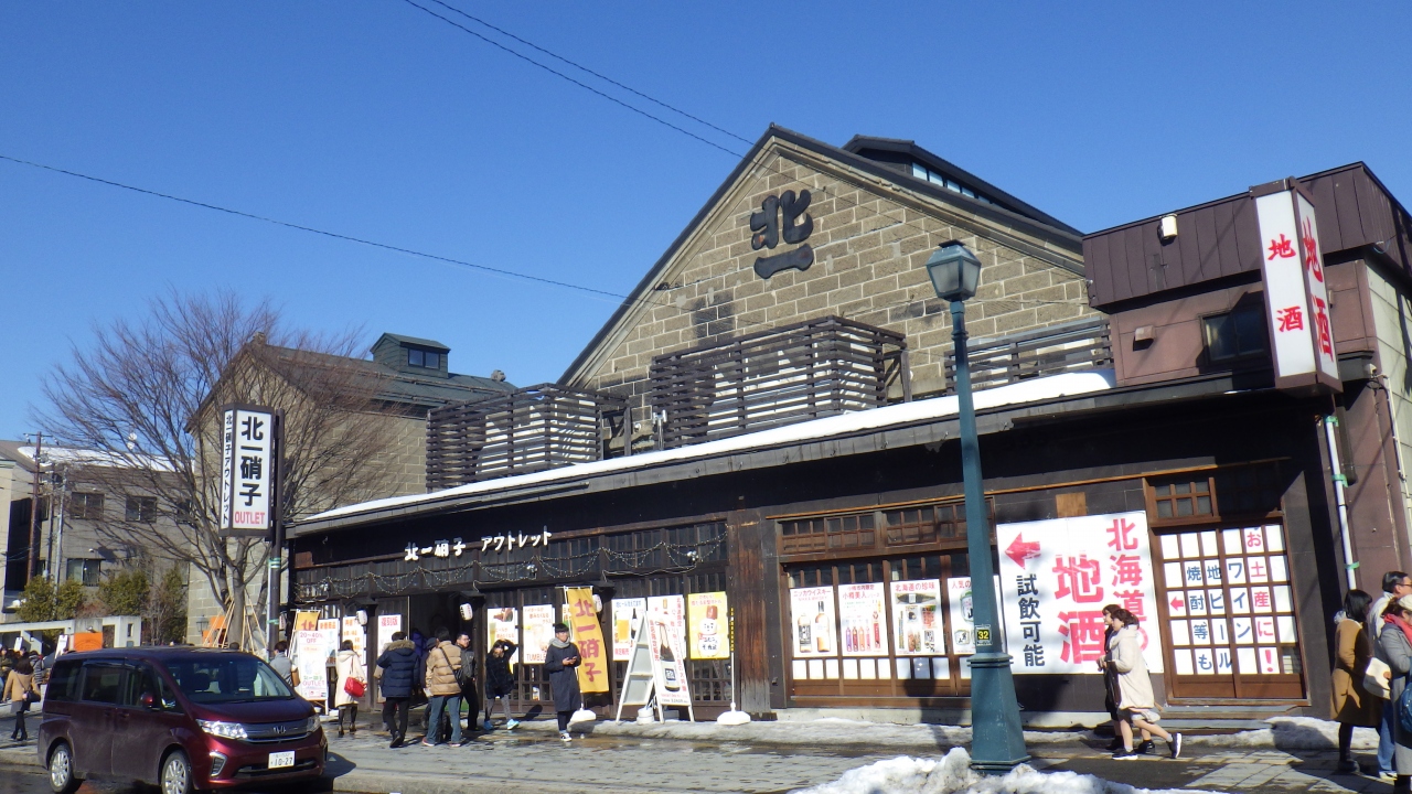 JR函館本線小樽駅を出て南東へ約1.7km、レトロ感のある街並みの堺町本通りと入船通りが交わるメルヘン交差点の堺町側ルタオ本店の左隣、小樽近郊で採れる軟石の壁面造切妻屋根の倉庫の様に大きな建造物に「北一」とはっきりわかる建造物がアウトレット館です。