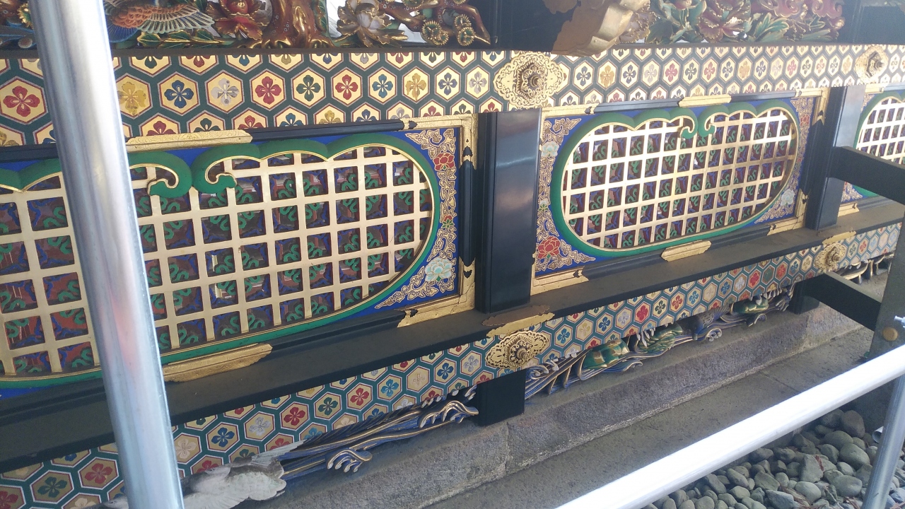 日光東照宮は徳川家康を神格化させお祀りするため息子の秀忠によって創建され簡素な造りだったものが、3代将軍家光によって豪華絢爛な建物へ変貌したもので、本殿と陽明門は他の建物とは一線を画す程際立った建造物で通常は非公開です。石の間は本殿から5段、拝殿から3段下にあり、「神界である本殿」と「俗世界である拝殿」との間に石の間にある連絡路で畳敷きの部屋です。写真撮影禁止で見学できるのは拝殿と石の間ですが、工事中でもありましたが天井には「鳥の絵」が絵描かれていていました。