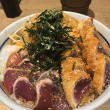 三宮のサンプラザ飲食店街にお店はあります。座席はカウンターのみです。生のカツオとカツオフライのミックス丼を注文。フレッシュなたっぷりの玉ねぎとカツオがとても相性良く、机にあるぬたを加えると更に美味しくなります。また最後に出汁をかけて食べるとこれまた違った美味しさに。一杯で様々な楽しみ方のできる素晴らしい丼です。