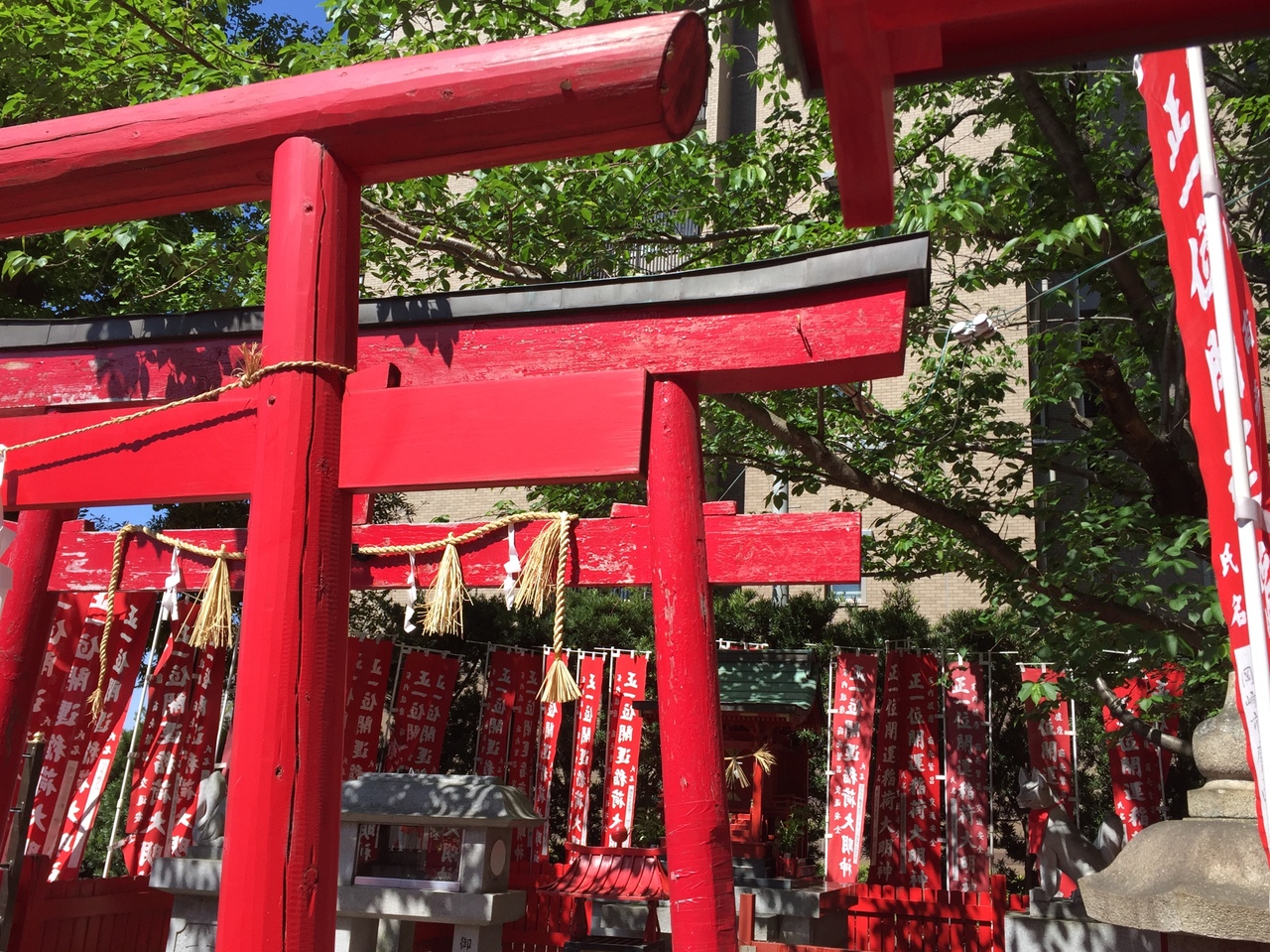 赤い鳥居の開運稲荷大明神にはあぶらあげも。