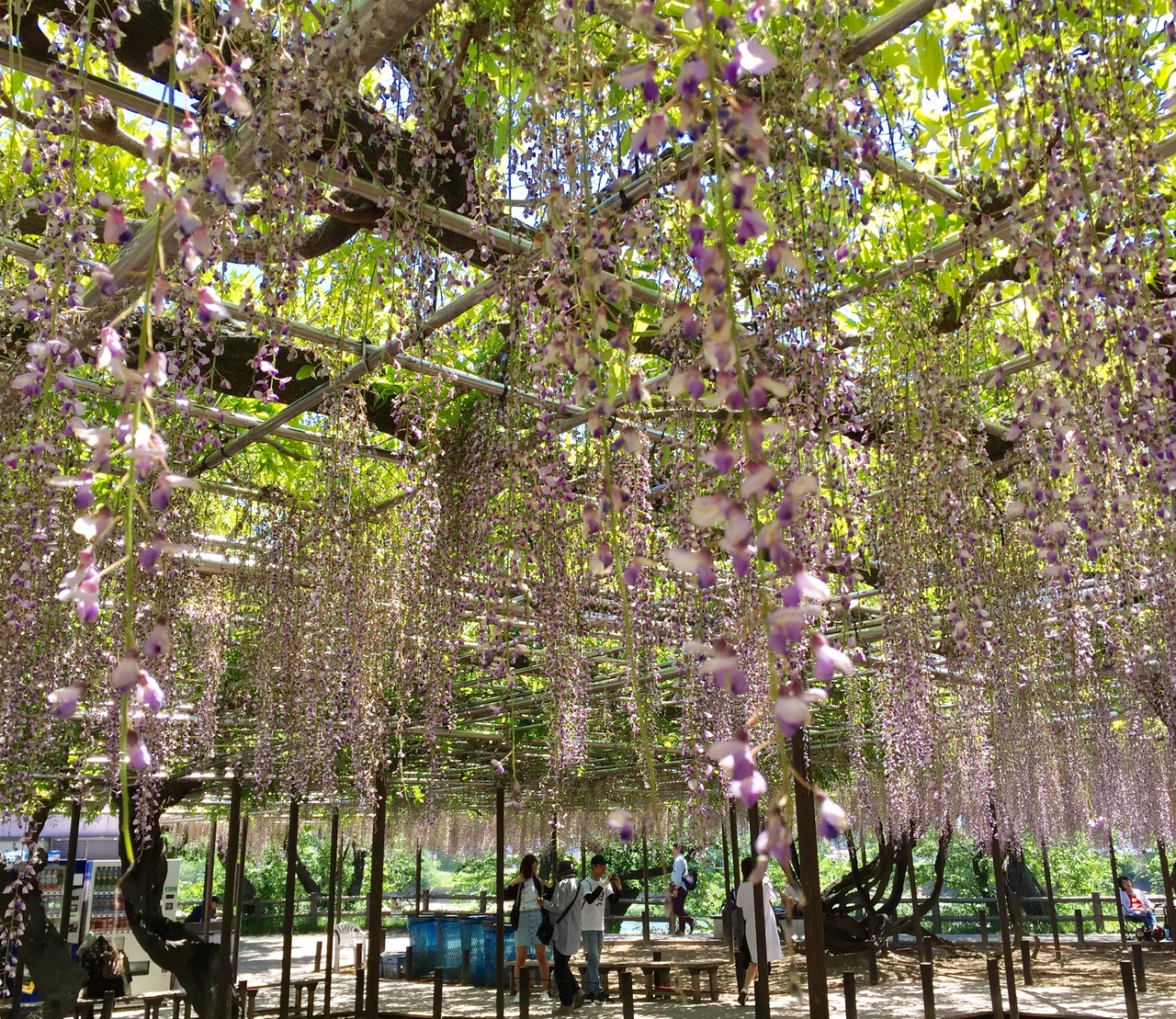 訪れたのが少し遅かったようで、残念ながら花の状態はちょっと元気がありませんでしたが、藤棚の下をゆっくり歩きながら、甘い香りと共に楽しんできました。