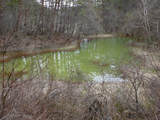 以前はもう少し赤っぽかった、というより泥水色だったかな、と記憶しています。今ではご覧のとおり混濁した緑色で、他の小さな沼と同じような色で個性が埋没しています。檜原湖側からこの赤沼まで来れば、終点の毘沙門沼はもうすぐです。