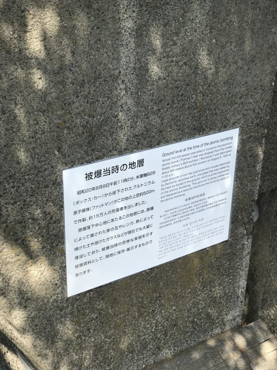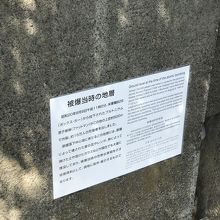 長崎市の平和公園、爆心地の階段を降りた川沿いで見られる、被爆当時の地層です。案内表示が複数あるのですぐわかります。