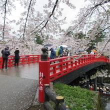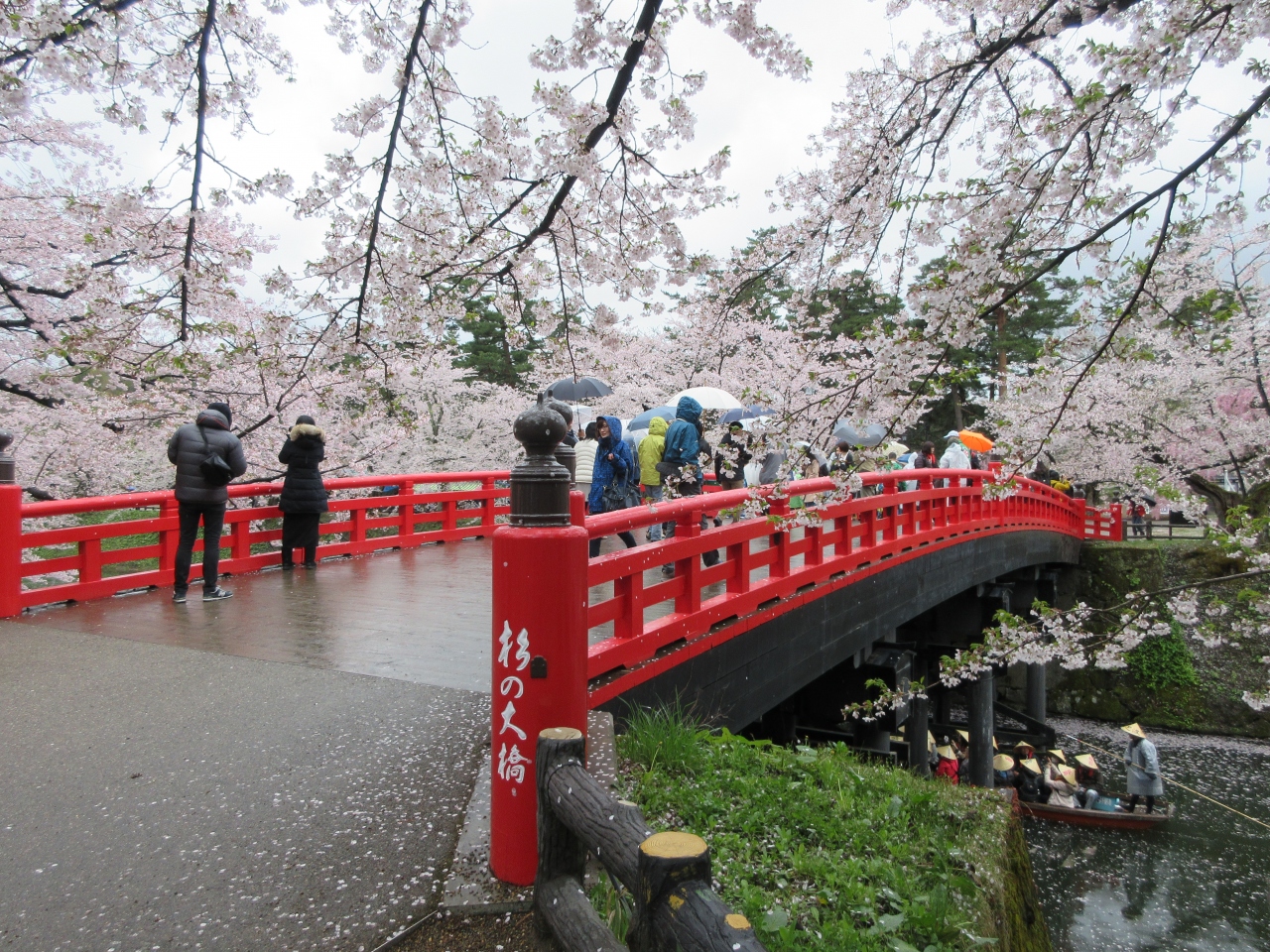 弘前城の二の丸へ入る赤い橋です。二の丸から本丸へ入る下乗橋は石垣と桜がきれいなのに対して杉の大橋は内濠を船が橋の下を通る風情がありました。内濠が直角に曲がっているので花筏を見ることもできて、混雑している下乗橋より杉の大橋の方が好みです。