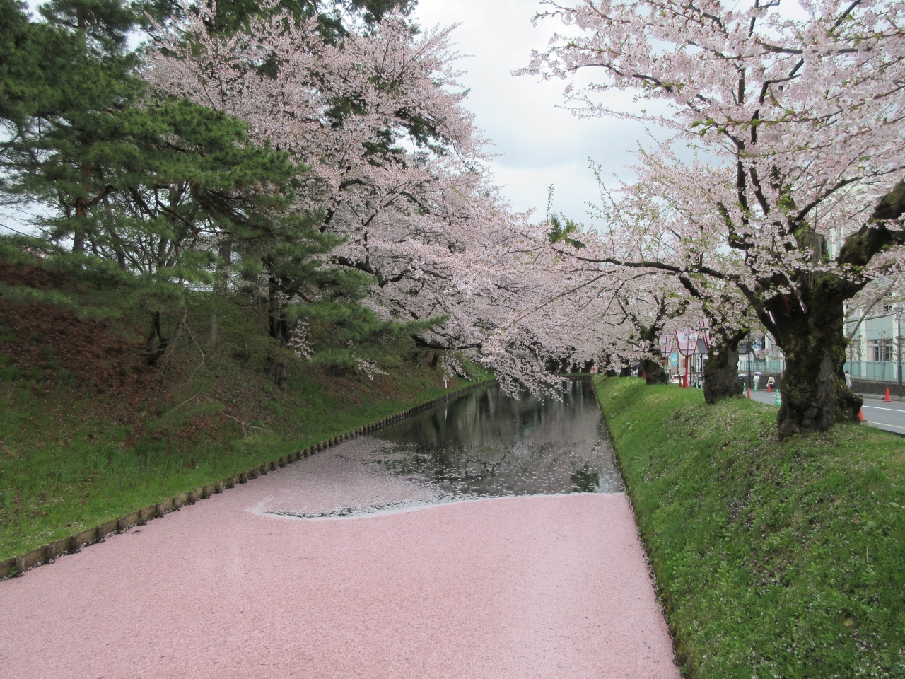 バスツアーで4月下旬に訪れました。弘前城址を中心とした広い公園です。弘前さくらまつりの期間で演芸場からアナウンスや音楽が聞こえ、公園内の桜並木に園芸店が出店して、まつりを盛り上げていました。本丸の有料区域に入らなくても桜を鑑賞できます。有名な花筏を中央高校口付近で見ることができました。本丸も含めて桜をゆっくり眺めるのに1時間半では足りませんでした。多くの観光客が訪れる桜の時期以外の静かな弘前公園に興味を持ちました。