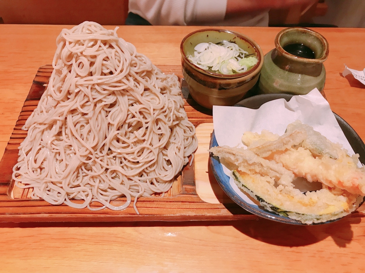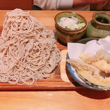 大盛り、富士盛りも料金無料。富士盛りをシェアし、天ぷら盛り合わせを注文。蕎麦ができたてはもちもちと弾力があって食べ応えがあって美味しいです。