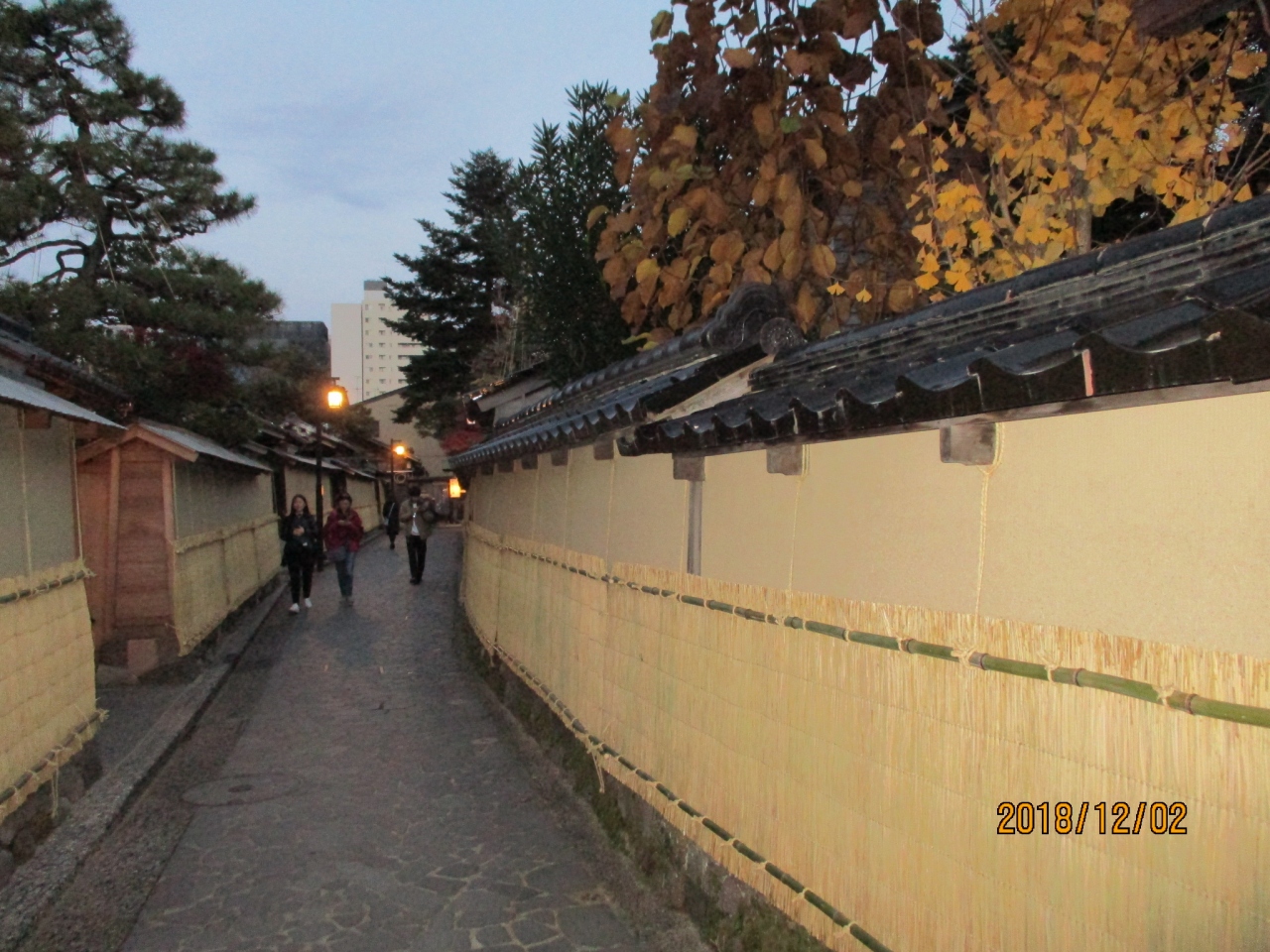 藩政時代に中級武士たちの屋敷が建てられたいっかくで、土塀や石畳、長屋門などが続く小路は、とても趣のあるエリアとなっています。訪れたときは、金沢の冬の風物詩となっている、雪から土塀を守るための薦がかけられている様子も見られました。