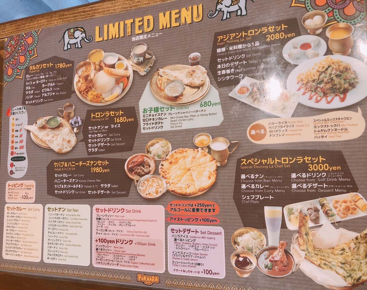 カレーの種類・辛さ、ナンの種類(ライスも選べます)、デザート、ドリンクがチョイスできます。