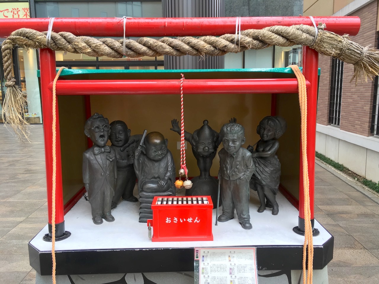 建屋の前に賽銭箱があり、六芸神の像が箱の周りに立っていました。