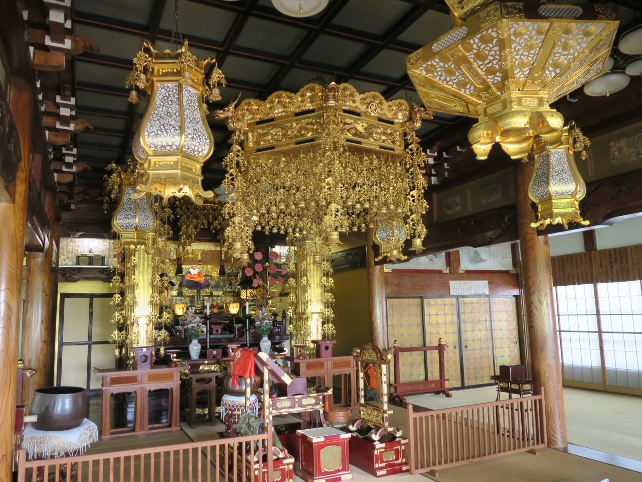 本堂の造りもかなり見物で海老虹梁、手挟などは彫刻が緻密で迫力があり見事でした。中を見ることもでき天蓋は意外と控え目、日蓮聖人でしょうか?持仏堂説法や遊説の様子を描いた絵などが掲げられていました。なかなか印象深かったですね。