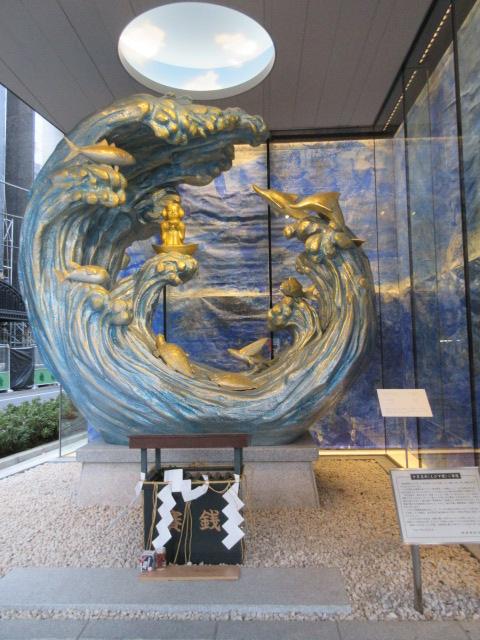 神田明神の境内にある像です。ちかくにだいこくさまの石像もあるのですが、それに比べると、少しわかりにくい場所にあります。大きな建物の横だからかな?あと、形も斬新で大きな波の中に小さな恵比須様が鎮座しています。色は波は青、恵比須様は金色です。比較的新しいのかな?きれいな像でした。