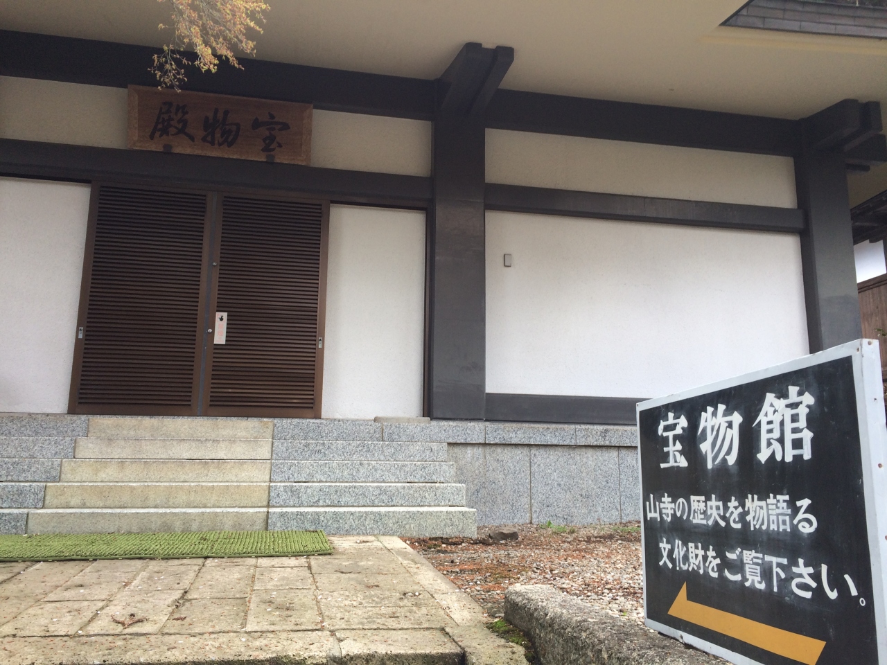 根本中堂から日枝神社を過ぎ、芭蕉と弟子曾良の銅像があり、その向い山側に白壁の建物、宝物殿がありました。ここには山寺の歴史を物語る仏像や宗教資料が展示されていました。子供達には少し難しそうですが、短時間で見学できるので良い機会でした。冬期間は休館するようなのでご注意を。