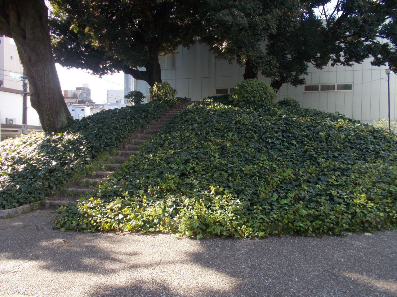 この那古野山古墳は大須界隈の中でも南西のエリアにあります。現在は浪越公園跡という小さな広場にあります。古墳は現在は円墳部分しか残っていないですが前方後円墳だったといわれています。周りはビルや建物に囲まれています。古墳の表示がないとただの小高い丘のようです。