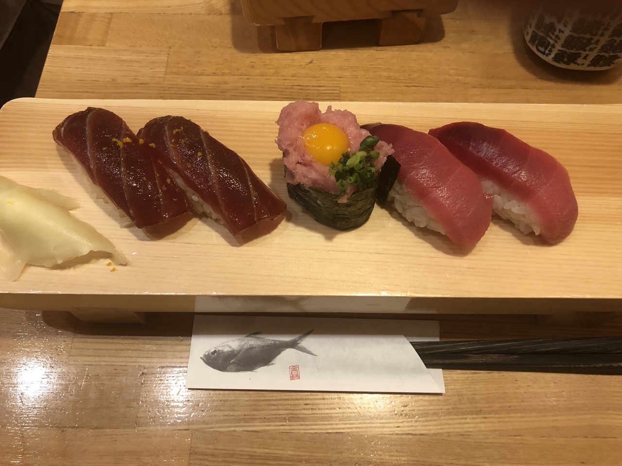 羽田空港から帰国して自宅に戻る時、マグロの寿司が食べたくなって、夕食で寄りました。マグロの寿司5巻のマグロづくしにイワシ、カツオを1個ずつ追加してオーダーしました。ネタもシャリも悪くなく、値段も1600円ちょっととお得でした。回転寿司よりお得で美味しいです。