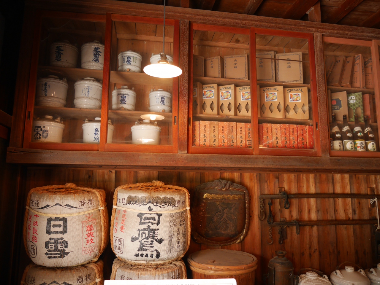 内部には古い酒樽や一斗瓶、台帳など店舗の様子がそのまま保存されていて、レトロな雰囲気を楽しめます。