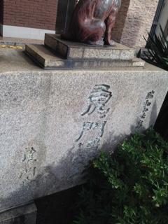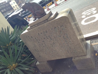 虎ノ門交差点そばのエクセルシオールカフェの前にこの碑はありました。虎ノ門と言うと、とても立派なモノを想像するのですが、とても小さな碑であった事に、ある意味とても驚きました。碑の上には、恐らく虎と思われるオブジェが載っているのですが、小さくて、最初は、かわいい猫かと思いました。