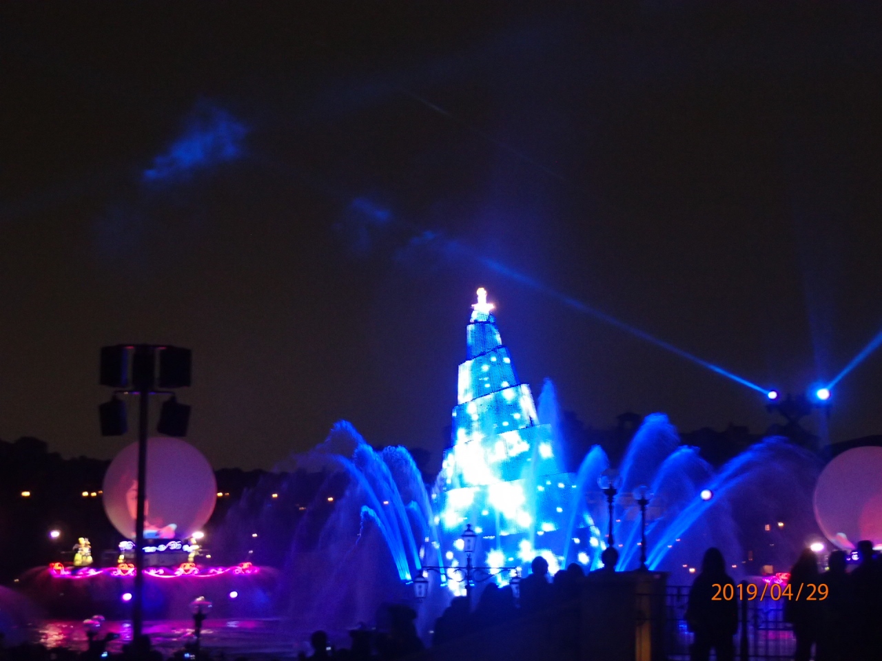 「水の近くだったらどこからでも見られます」というアナウンス通り、見ることは出来ましたが、ディズニーランドのパレードよりも遠くなので少し見づらかったです。天候の都合で5分程短いショーになってしまったそうです。(初めて見たのでどこが省略されたのかは不明)