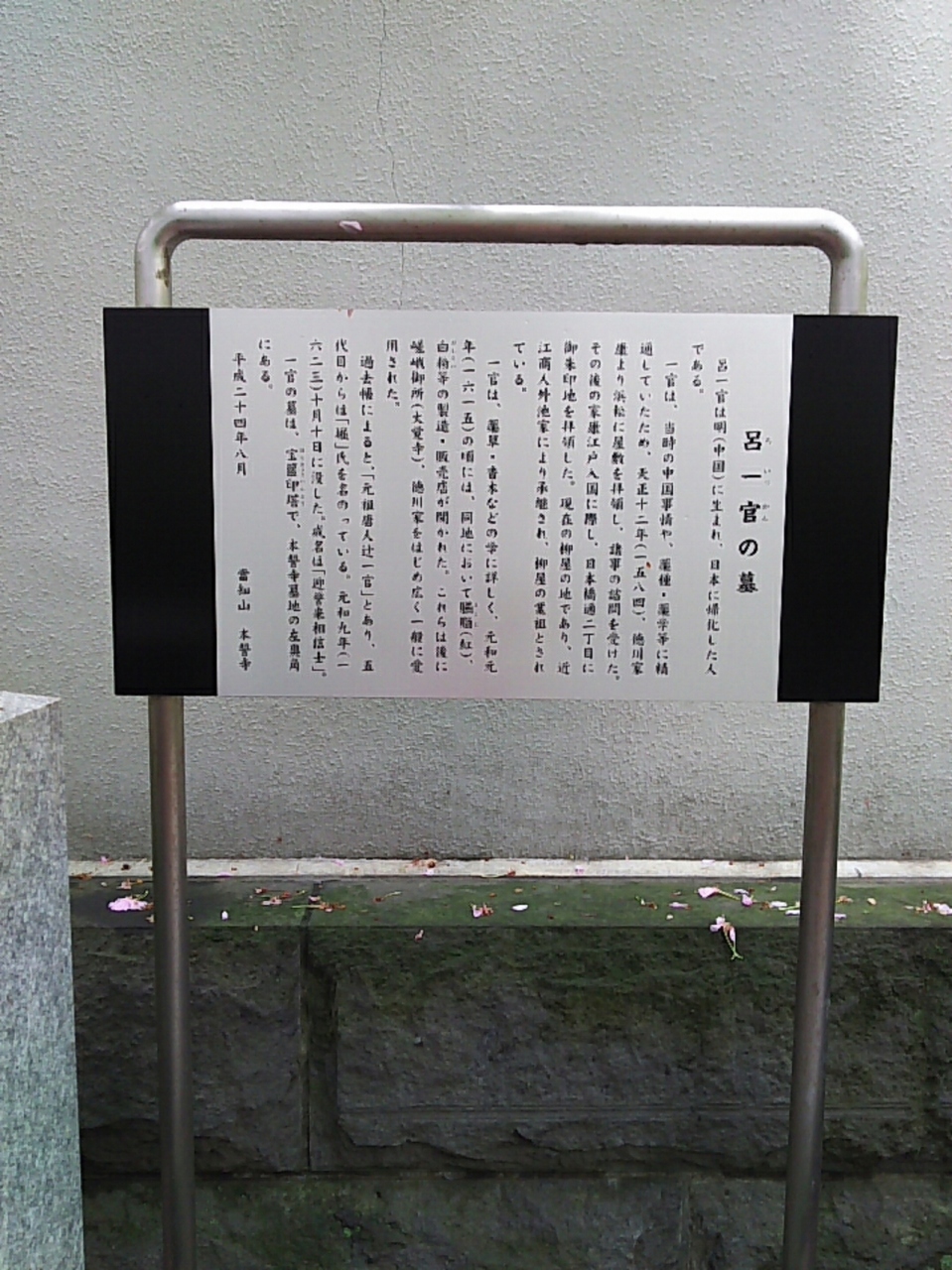 清澄白河駅から清澄庭園など周辺を散策にて寄りました。江戸時代中期の国学者で歌人の村田春海(はるみ)と、明(中国)から帰化して中国事情に詳しく、薬学にも精通していたため徳川家康から屋敷を拝領した呂一官の墓があります。解説板もあるので読んで勉強になりました。