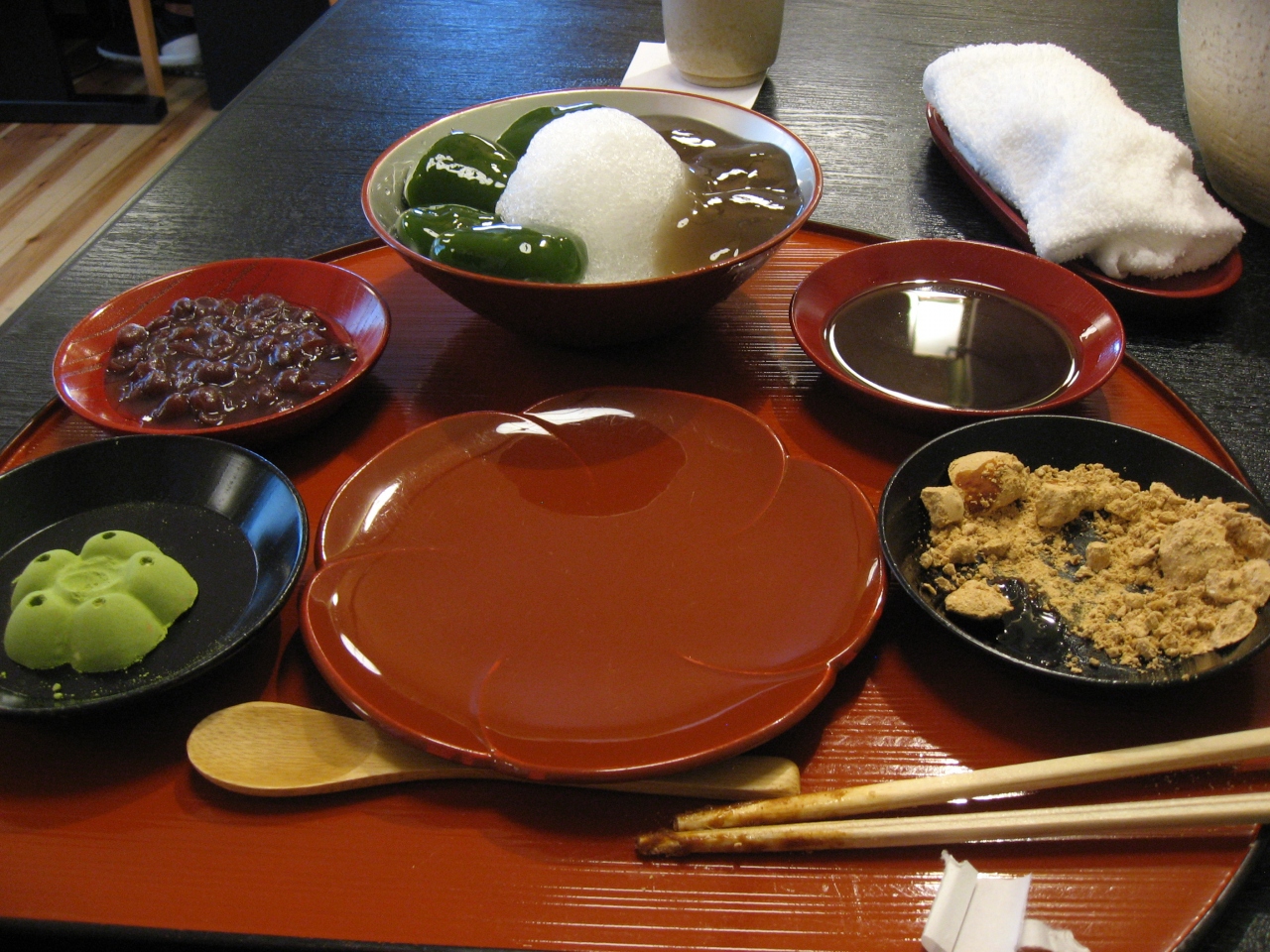 15分位で入店。わらびもちとくずもちが両方楽しめる「あいもり」というのをを頼んでみました。かき氷のうえにのってきます。確かに両方とも、特にくずもちは少し暖かかったら溶けてしまいそうでした。くずもちはお茶の味が付いており、知っているくずもちとは随分違うけど美味しかった。わらびもちもこれが本当のくず粉を使っているんでしょうね。柔らかくて美味しかった。